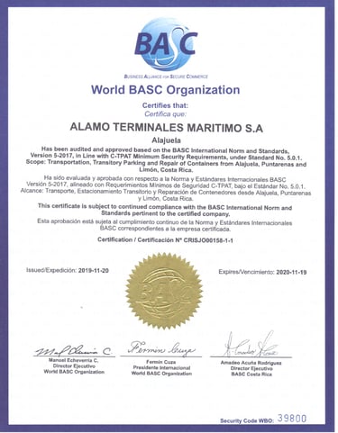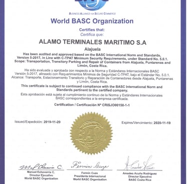Alamo Terminales Marítimos S.A. complies with all applicable legal and regulatory requirements, both in transportation and in its role as an auxiliary to public functions for the custody of cargo in temporary storage facilities. Furthermore, we are committed to the continuous improvement of our BASC Supply Chain Security Management System (SGCS BASC).